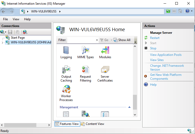 To save time, after all this is a lab environment, you don’t have to enable SSL, but in the real world, for security purposes its great practice to do this. If however, you still want to use SSL for security purposes, just exit the wizard, and click on the name of your server. If you do and scroll down a little bit, you will come across something called “Server Certificates.”