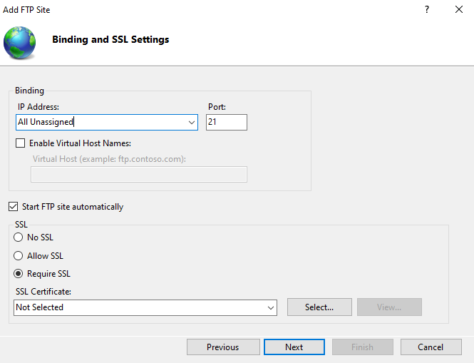 Once finished reopen the wizard to open an FTP site, and head to the second part with the IP Address and SSL options. Select your SSL certificate if you really want to, as well as leave the port at the default value of 21, then move on to the last part: