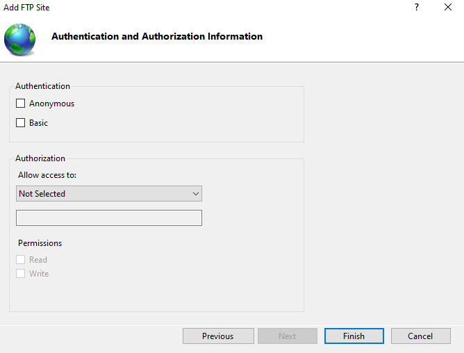 From here select basic, and with the drop down menu, either make it accessible to all computers connected, or choose specified users as well as the permissions for either. After that, the FTP site will be up and running. To access it, simply go to Microsoft Edge again, and type in the searchbar, “ftp:” followed by the IP Address you used (make sure its not the same as the web server).